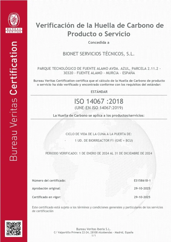 En BIONET seguimos avanzando hacia una biotecnología más sostenible. Hemos calculado y verificado la Huella de Carbono de nuestro Biorreactor F1, conforme con la norma ISO 14067:2018, lo que nos permite identificar oportunidades de mejora ambiental con el fin de reducir el impacto ambiental asociado a su fabricación.